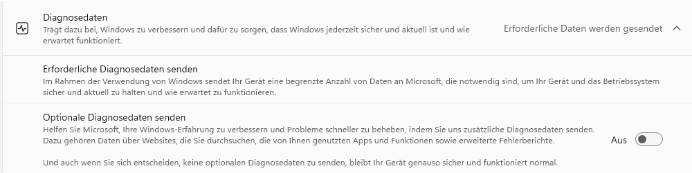 Die optionalen Diagnosedaten sind auszuschalten – das ist korrekt. Die erforderlichen Diagnosedaten kannst du nicht deaktivieren, aber das ist das Minimum, das Microsoft verlangt.
