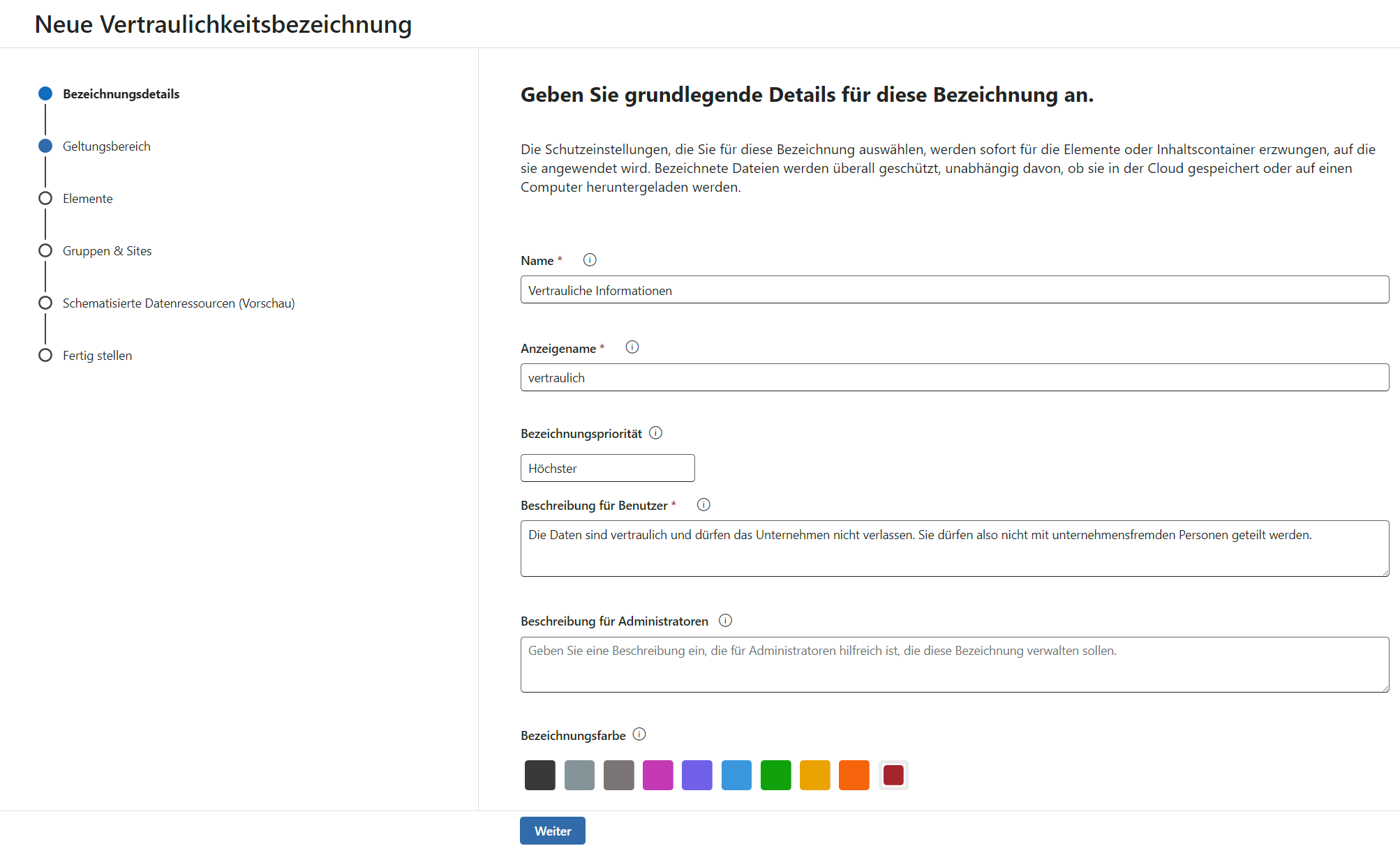 Hinweis: Auf der Seite hast du auch die Möglichkeit, „Schnelles Einrichten und Veröffentlichen von 12 empfohlenen Bezeichnungen mit nur einem Klick“ auszuwählen. - Du gelangst nun in den Bereich Bezeichnungsdetails, in dem die Vertraulichkeitsbezeichnung benennen kannst.