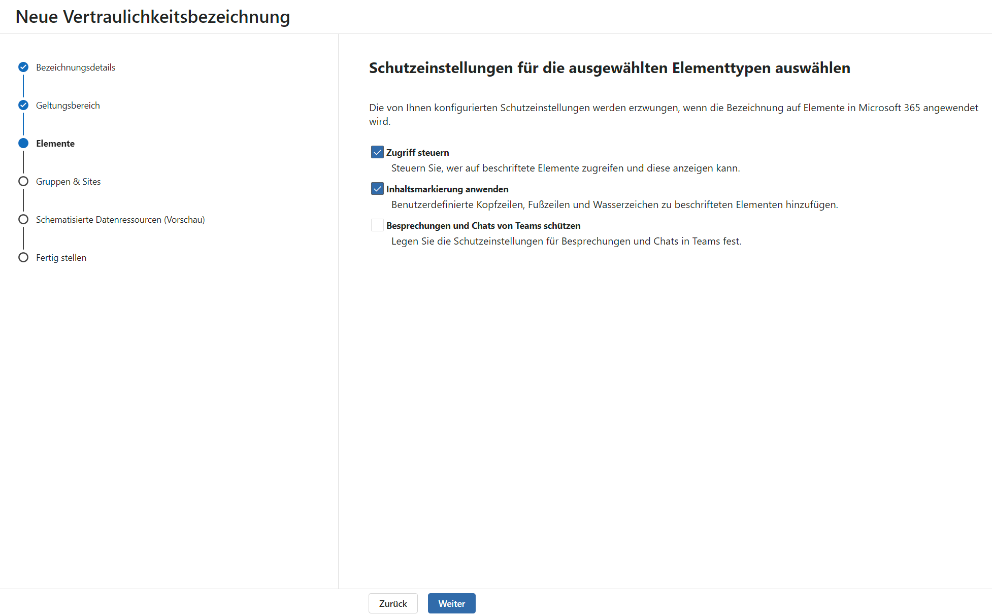 - Auf Weiter klicken, damit du zum Bereich Elemente gelangst. Hier wähle ich Zugriff steuern und Inhaltsmarkierungen anwenden aus.