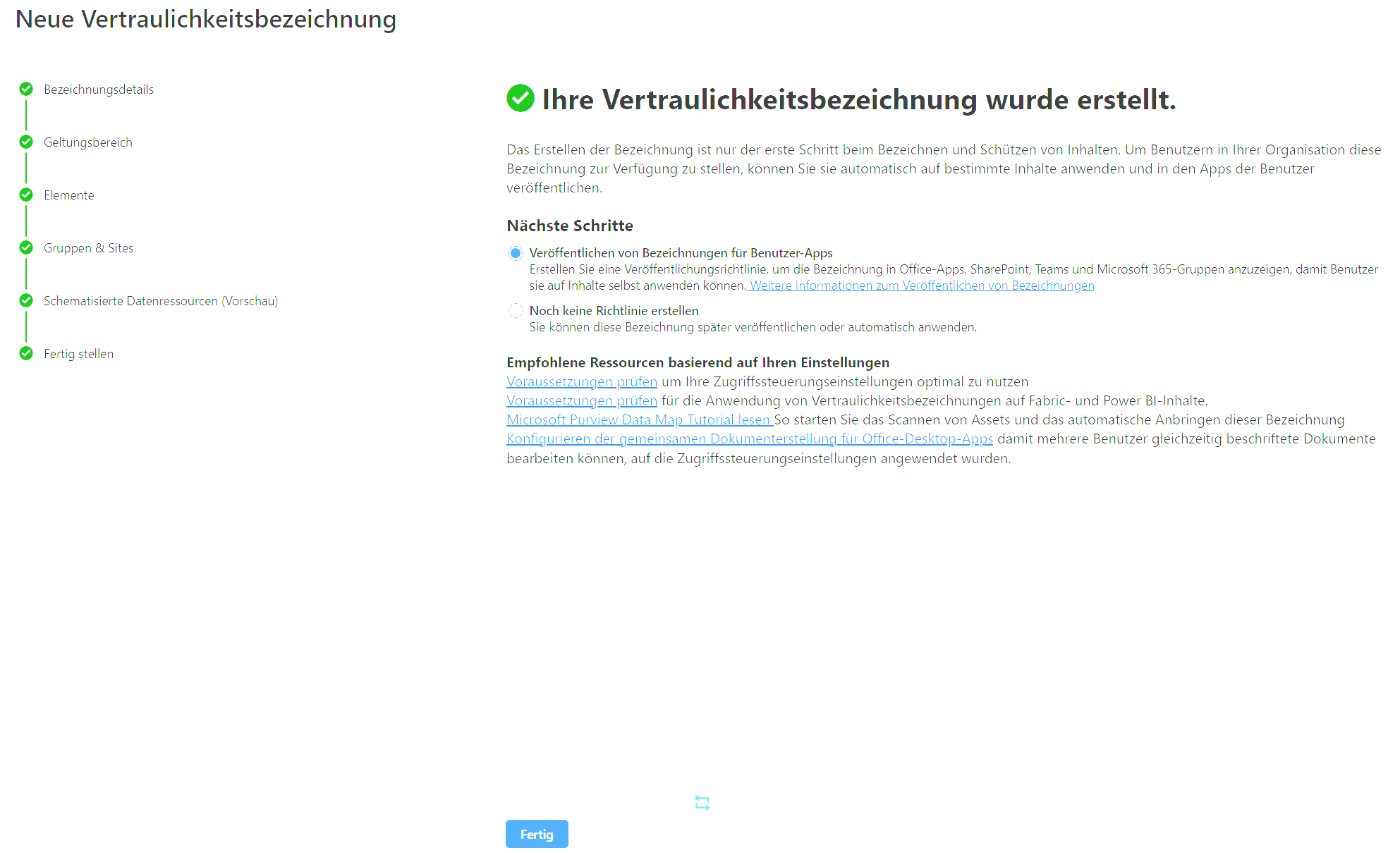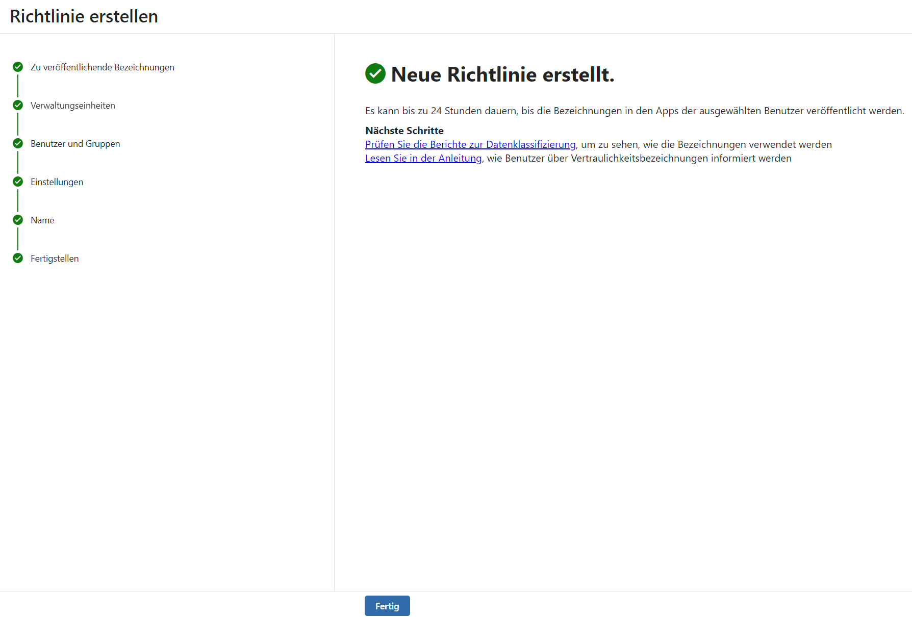 - Mit einem Klick auf Fertig gelangst du in den Bereich Bezeichnung veröffentlichen. Klicke hier Neue Bezeichnungsrichtlinie erstellen, wähle die zu veröffentlichende Vertraulichkeitsbezeichnung(en) aus (in Beispiel wurde sie vertraulich benannt). Klicke dann auf Hinzufügen und auf Weiter.