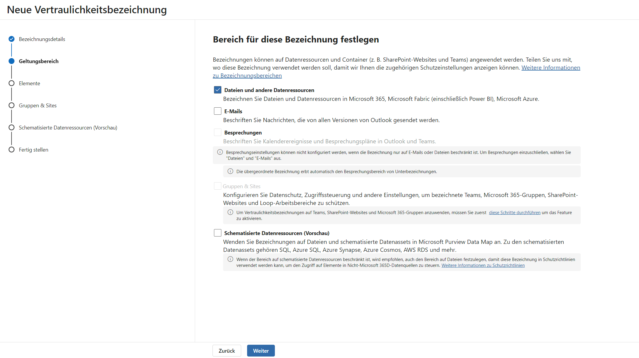- Im Bereich Automatisches Bezeichnen für schematisierte Datenressourcen (Vorschau) werden ebenfalls keine Anpassungen durchgeführt, klicke auf Weiter.