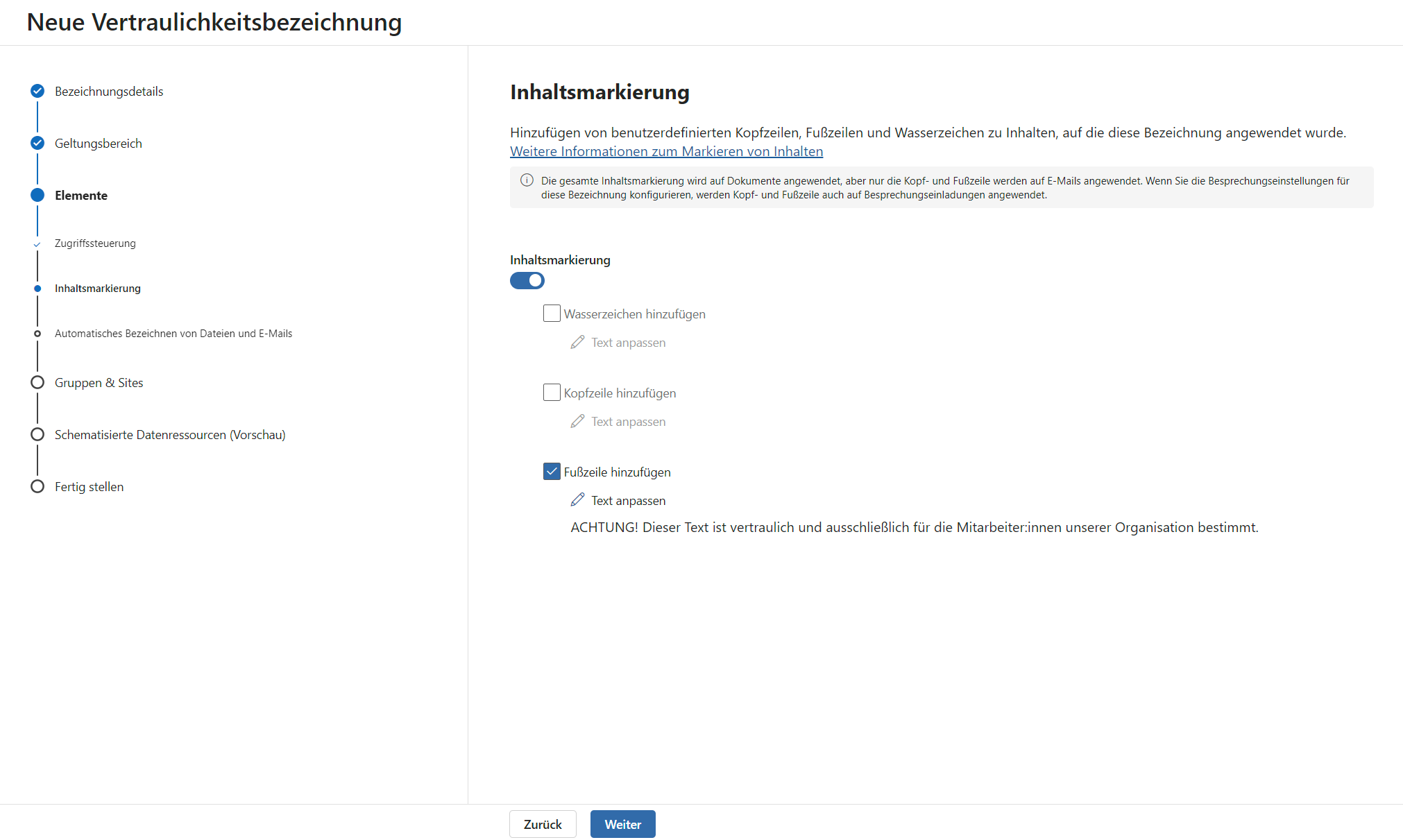 Unter dem Punkt Bestimmten Benutzern und Gruppen Berechtigungen erteilen solltest du auf Berechtigungen zuweisen klicken, um einer oder mehreren Personen, bzw. Gruppen die gewünschten Rechte zuzuordnen. Speichere die Berechtigungen und klicke auf Weiter. - Nun bist du auf der Seite Inhaltsmarkierung. Da ich in den Fußzeilen der entsprechenden Dokumente einen Text für vertrauliche Inhalte angeben möchte, wähle ich den Punkt Fußzeile hinzufügen aus und ich passe den Text an. Speichere den angepassten Text und klicke auf Weiter.