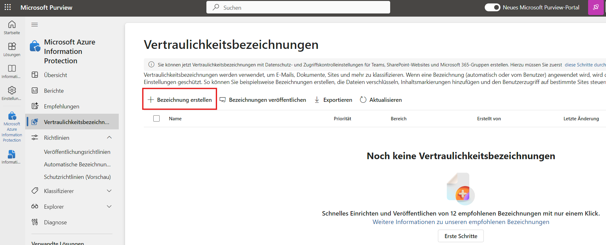 - Klicke auf Lösungen (links im Menü), dann auf Microsoft Azure Information Protection und anschließend auf Vertraulichkeitsbezeichnungen.