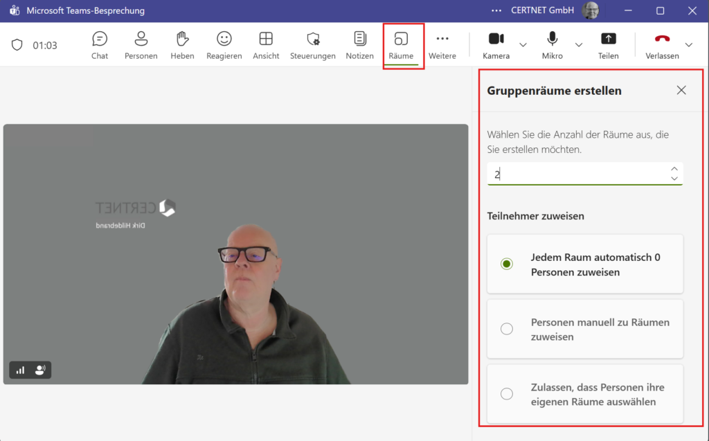 Auch direkt im laufenden Meeting lassen sich Breakout Rooms erstellen. Du kannst in der Menüleiste einfach auf „Räume“ klicken.
