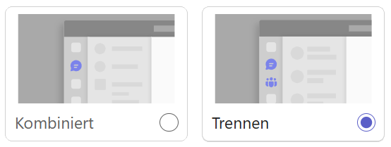 Hier entscheidest du, ob Unterhaltungen oder Chats in einem kombinierten Menü gemeinsam mit deinen Teams angezeigt werden sollen, oder ob die Unterhaltungen oder Chats in einem von Teams getrennten Menü dargestellt werden. Kombiniert bedeutet, dass nur ein Menüpunkt Chat erscheint und deine Teams darin untergebracht sind. Wenn du Trennen wählst, werden zwei Menüpunkte (Chat und Teams) angezeigt.