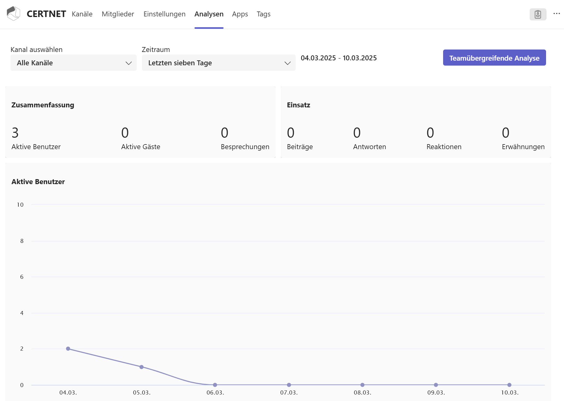 Hier kannst du Analysen zur Nutzung deines Teams und der Kanäle über verschiedene Zeiträume durchführen.