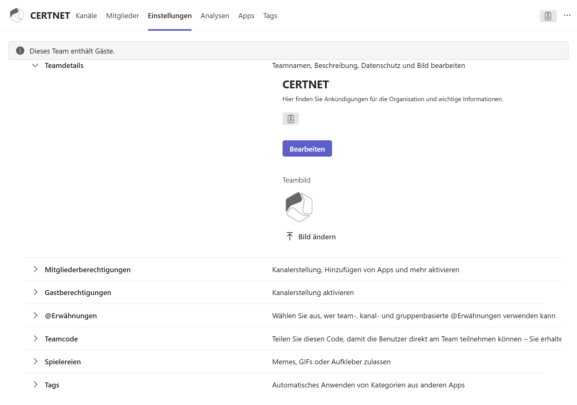 In diesem Bereich kannst du den Teamname, die Beschreibung, aber auch den Datenschutz (Typ) (Privat, Öffentlich oder Organisationsweit) anpassen. Du kannst auch das Bild des Teams ändern.