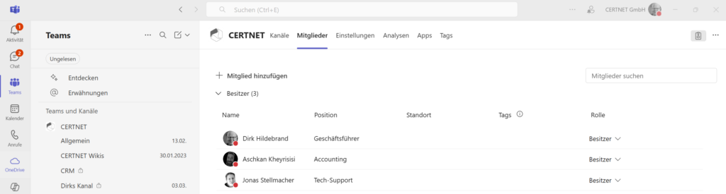 Im Bereich Besitzer und Mitglieder und Gäste siehst du, wer sich im Team befindet. Besitzer können das Team und die Kanäle gestalten und Mitglieder hinzufügen und entfernen. Mitglieder können dies nicht.