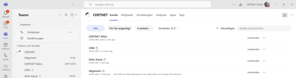 Rechts hinter den Kanälen hast du die Möglichkeit, für einzelne Kanäle die Tasten Ausblenden oder Anzeigen zu klicken. Der entsprechende Kanal wird dann (links im Bereich unter Teams) aus- oder eingeblendet. Somit kannst du für mehr Übersicht sorgen, wenn du die Kanäle, in denen du nicht arbeitest, ausblendest.