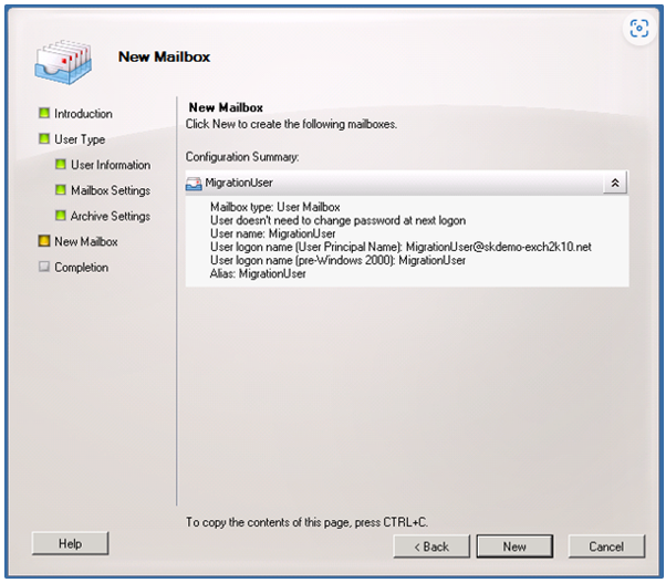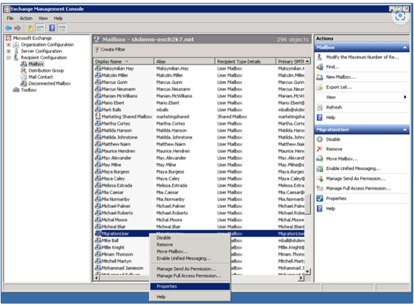 - Gehe zurück zur Exchange Management Console (Exchange Management Konsole) und suche den MigrationUser.