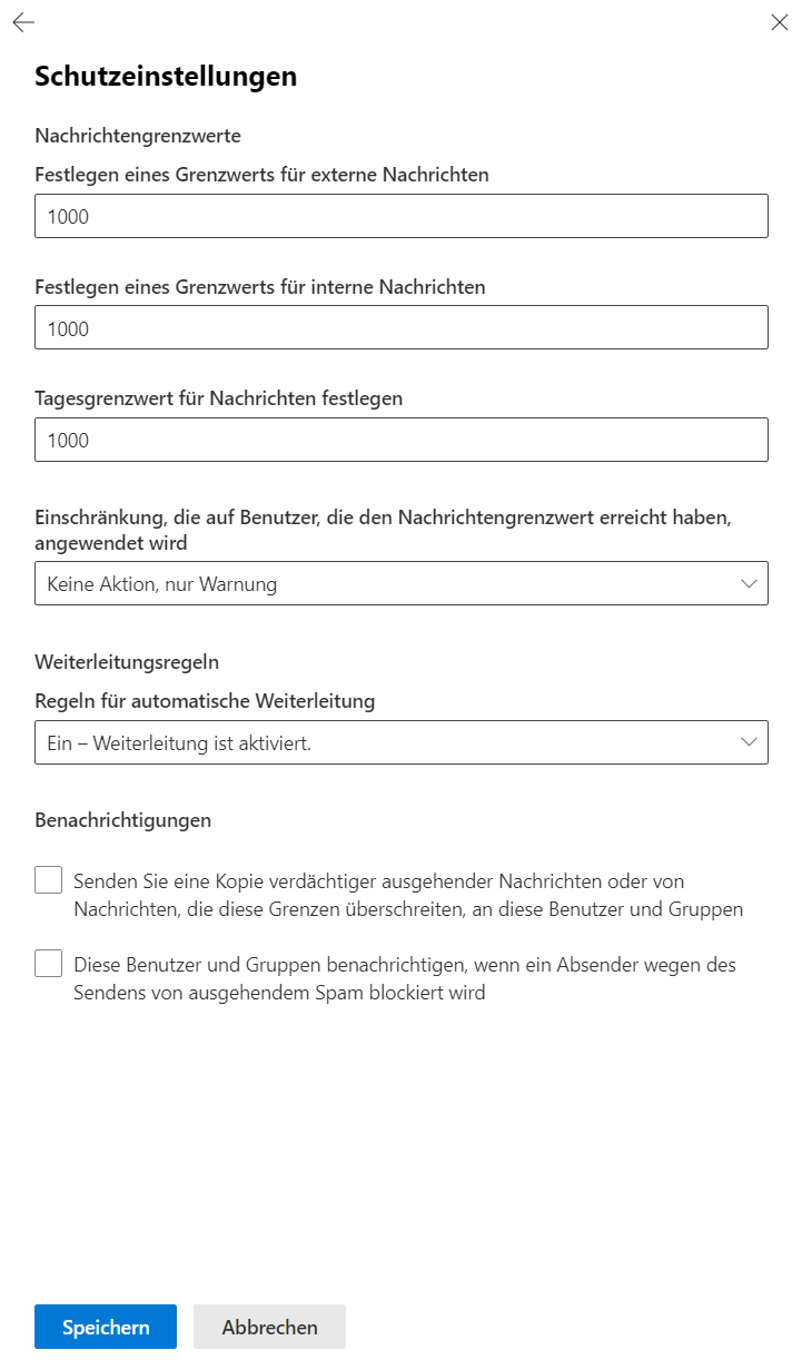 Erstelle eine neue Richtlinie oder passe die Antispam-Ausgangsrichtlinie (Standard) an. Hier kommt ein Vorschlag für die Einstellungen: